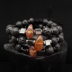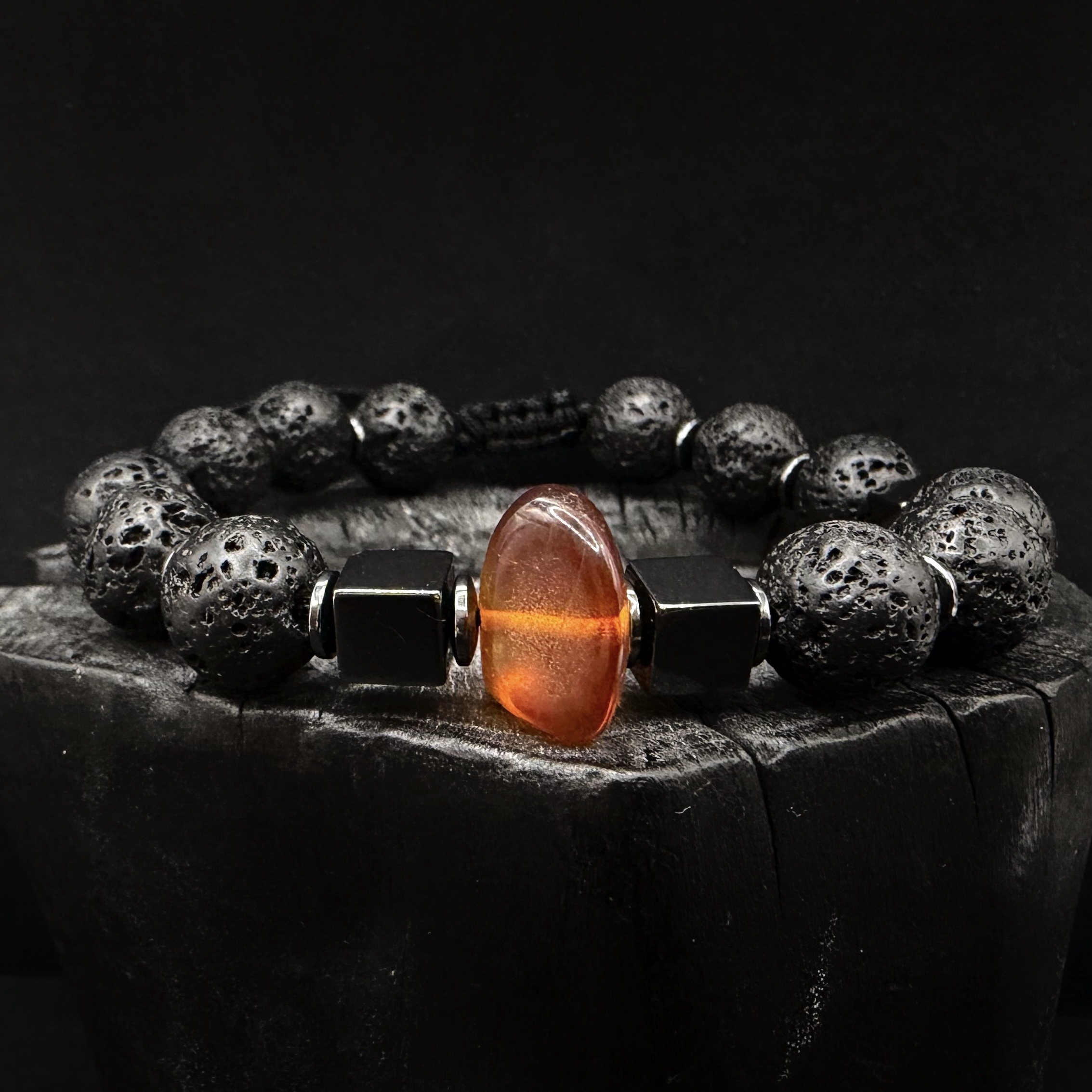 Ręcznie robiona bransoletka z Lawy wulkanicznej 10mm i hematytu ozdobiona Bursztynem.