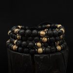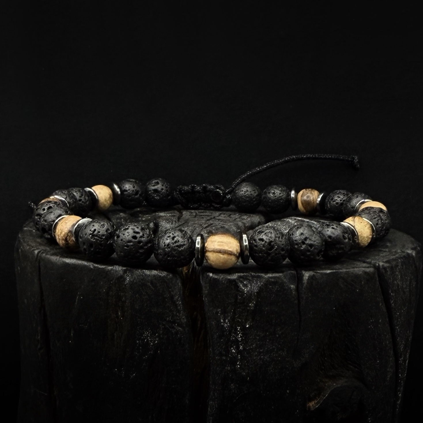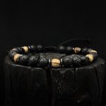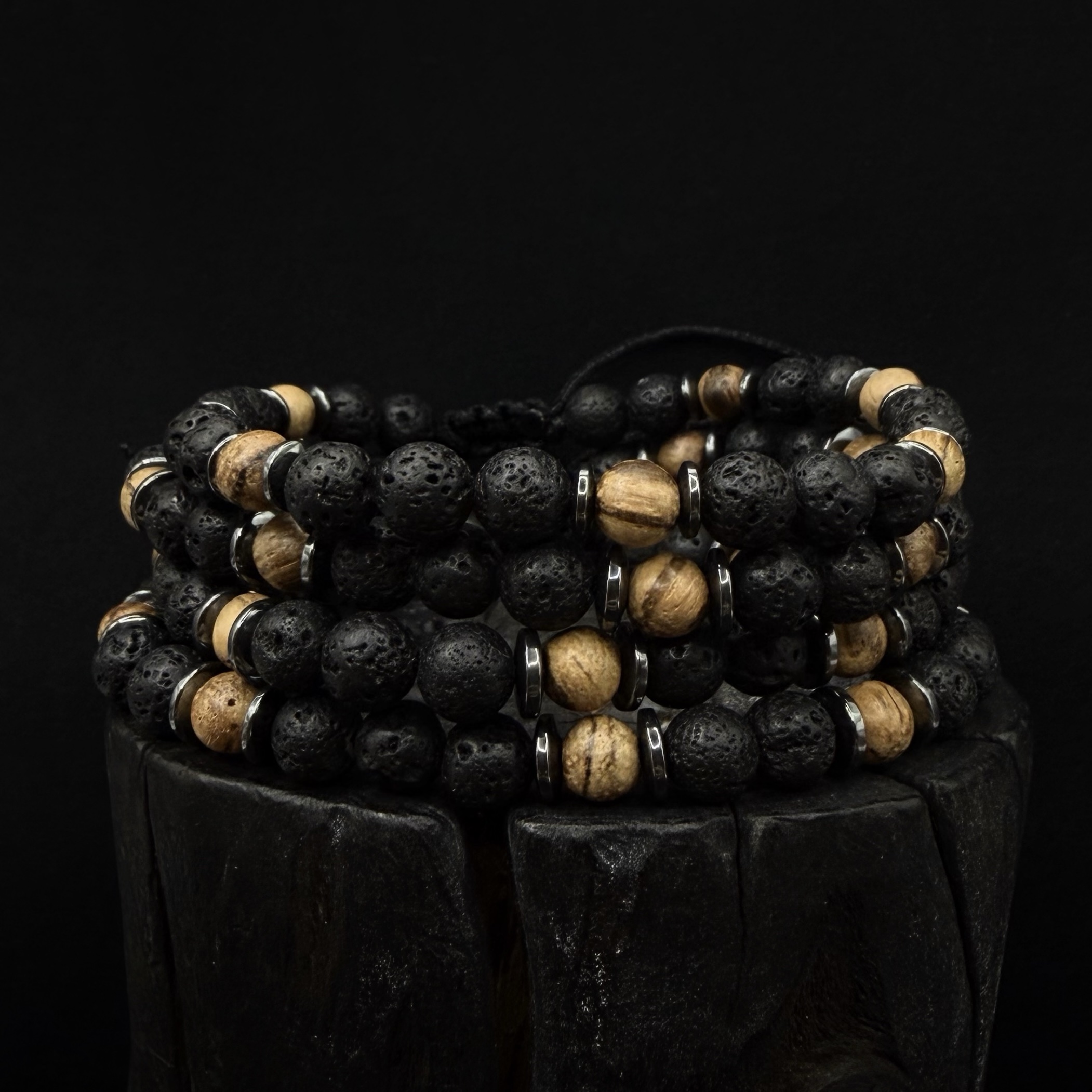 Ręcznie robiona bransoletka z Lawy wulkanicznej 6 mm , hematytu i drewna Gruszy .