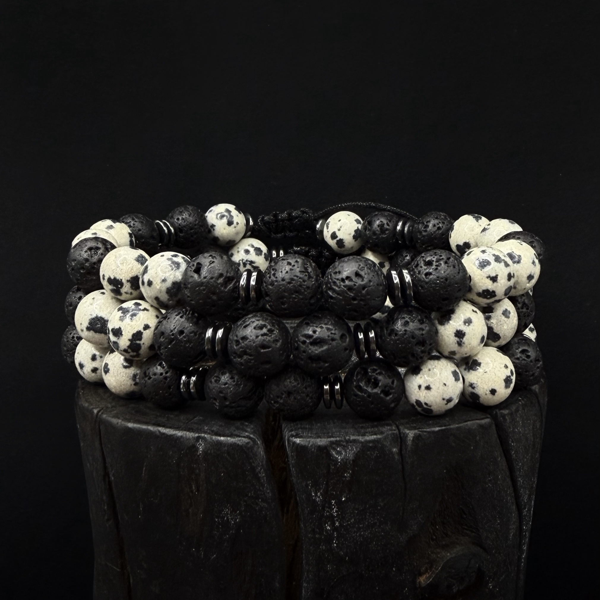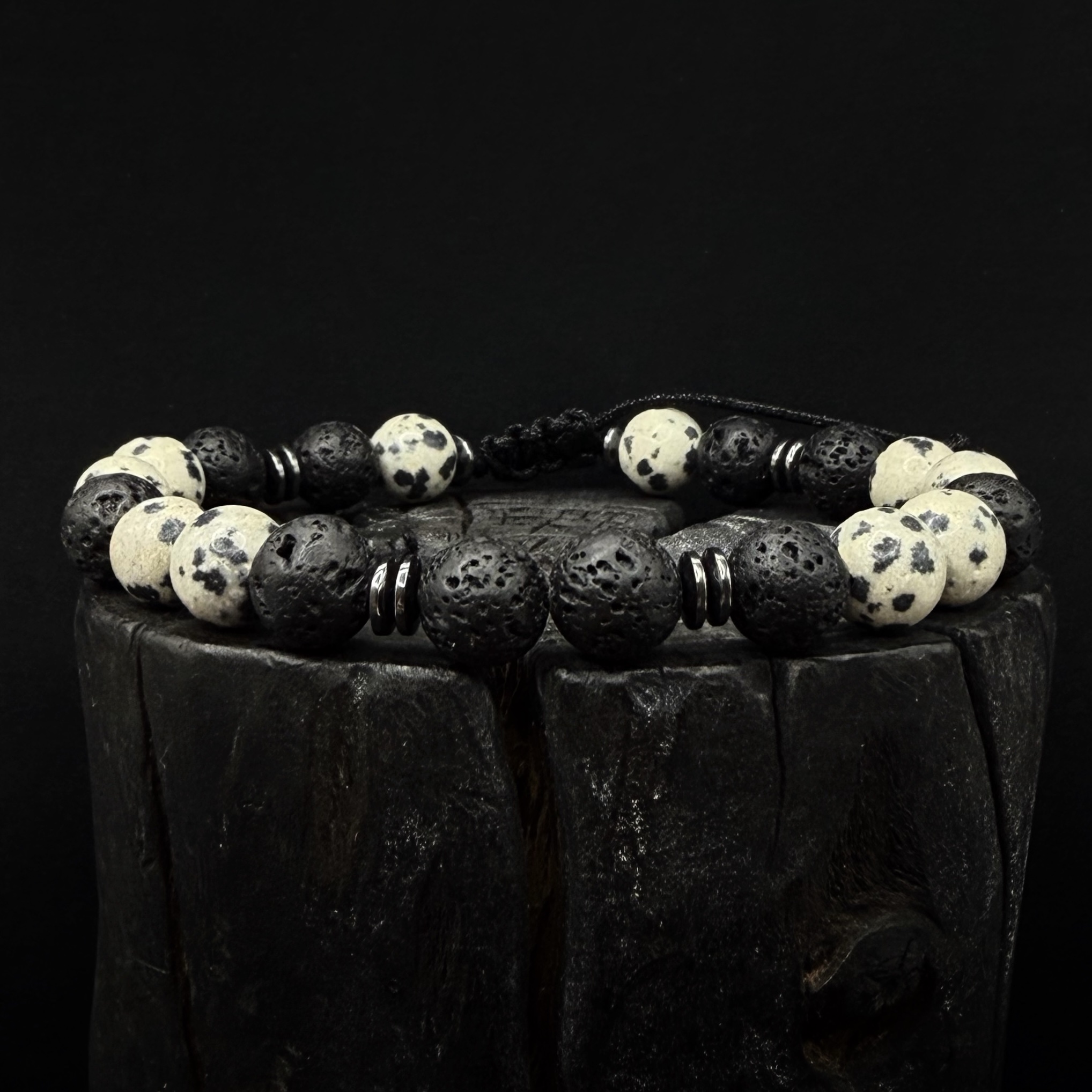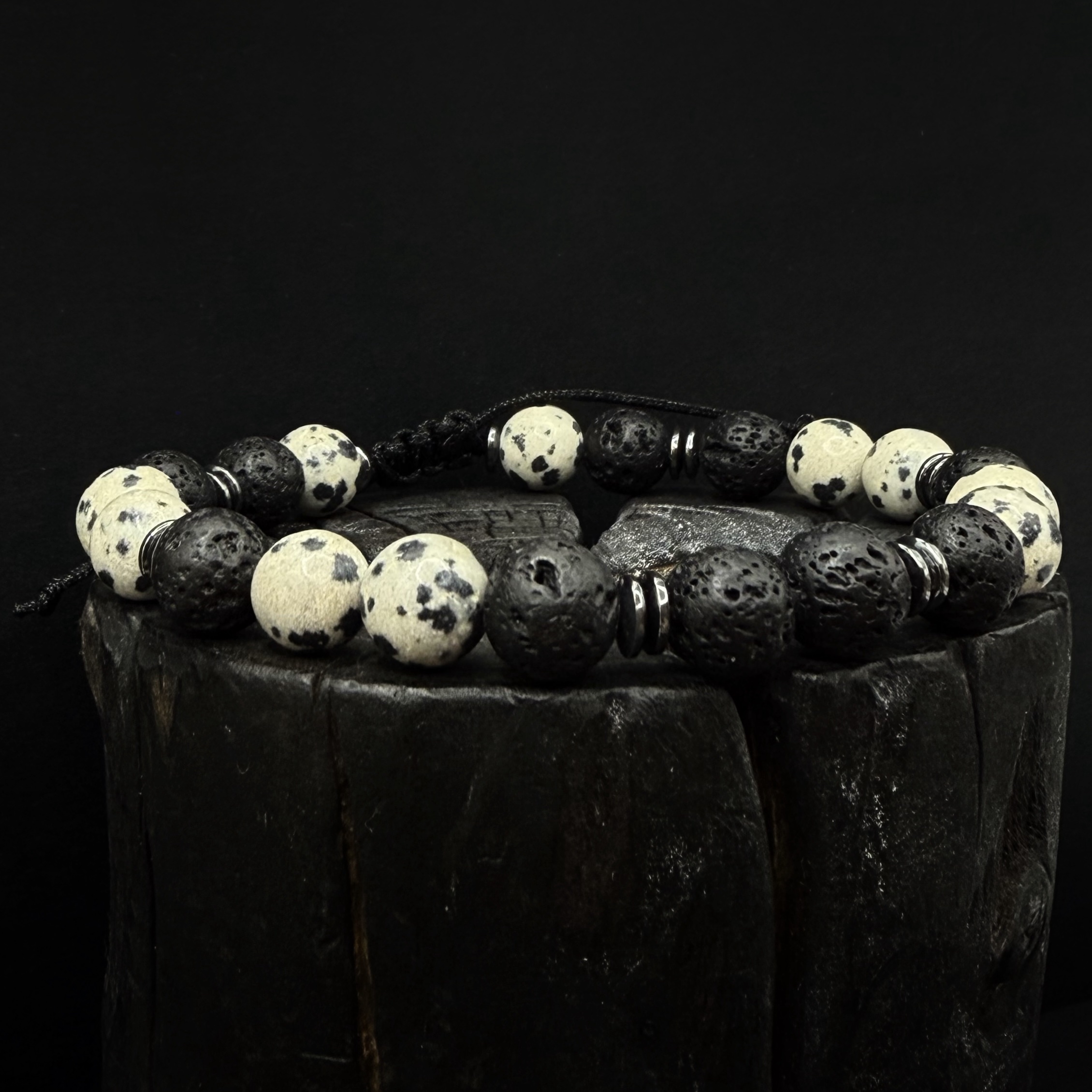 Ręcznie robiona bransoletka z Lawy wulkanicznej 8mm , hematytu i Jaspisu Dalmatyńskiego.